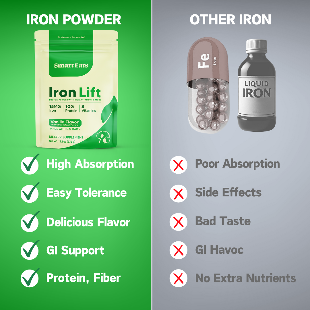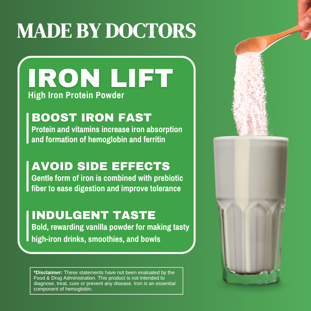 ⚡ IRON, PROTEIN, VITAMINS – Patent-pending recipe designed to improve iron absorption and utilization for increased ferritin and hemoglobin levels.