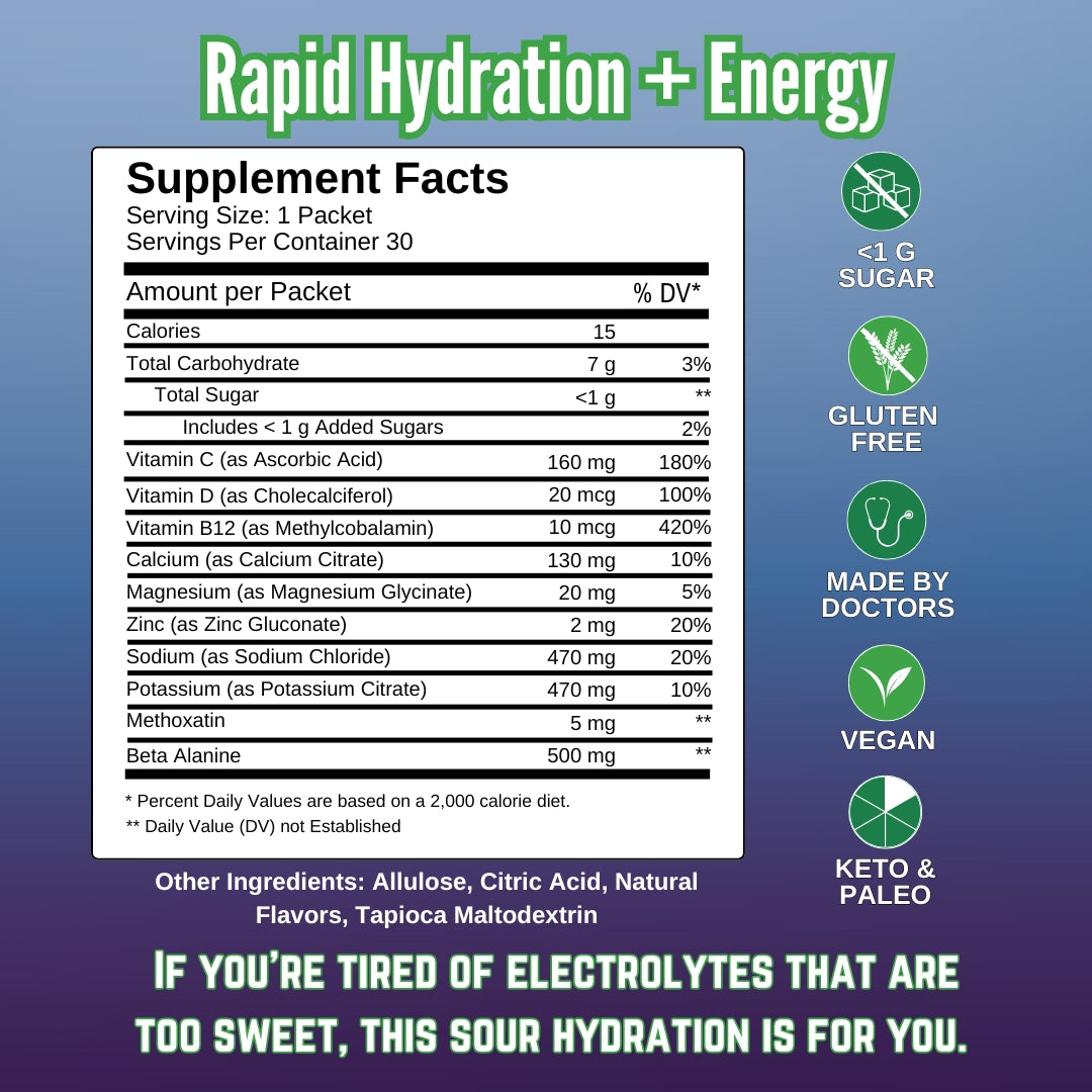 Amount per Packet (% DV): Calories: 15 | Total Carbohydrate: 7 g (3%) | Total Sugar <1g | Includes < 1 g Added Sugars (2%) | Vitamin C (as Ascorbic Acid) 160 mg (180%) | VItamin D (as Cholecalciferol) 20 mcg (100%) | Vitamin B12 (as Methylcobalamin) 10 mcg (420%) | Calcium (as Calcium Citrate) 130 mg (10%) | Magnesium (as Magnesium Glycinate) 20 mg (5%) | Zinc (as Zinc Gluconate) 2 mg (20%) | Sodium (as Sodium Chloride) 470 mg (20%) | Potassium (as Potassium Citrate) 470 mg (10%) | Beta Alanine 500 mg | Methoxatin 5 mg