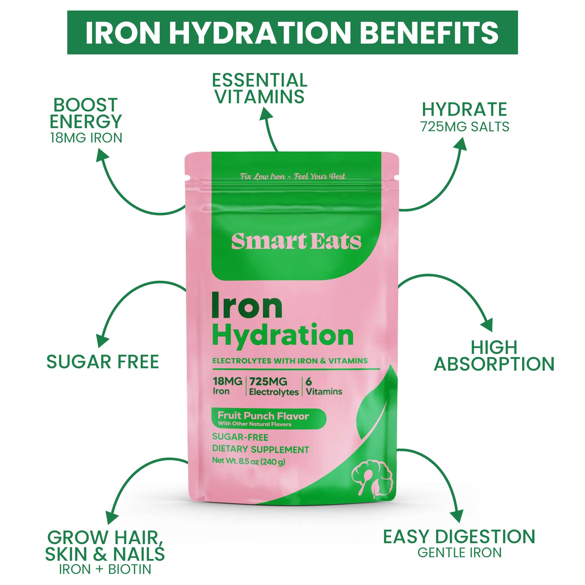 Iron Hydration - 18mg Gentle Iron, 725mg Electrolytes, 6 Vitamins to Boost Absorption, Sugar Free, Simple Ingredients, Fruit Punch Flavor - 30 Scoops